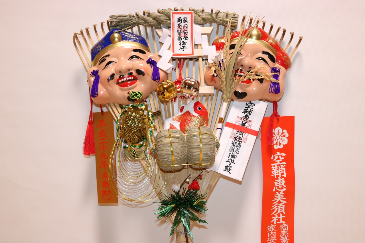 「福をかきこむ」意味合いがあり、熊手へえびす面や様々な装飾がされた縁起物